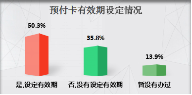 在线上问卷调查中,50.3%的消费者办理的预付卡设定了有效期限,35.8%没有设定有效期限。