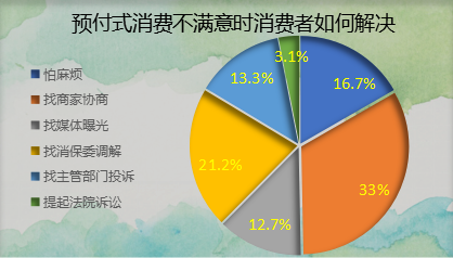 线上问卷调查结果显示,如果消费者对预付式服务消费不满意,33%的消费者会找商家协调,21.2%找消保委调解,16.7%怕麻烦,13.3%找主管部门投诉,12.7%会找媒体曝光,3.1%的消费者会提起法院诉讼。