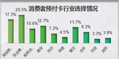 从办卡选择的行业上来看,美容美发(含美容、美甲、理发)、综合零售(含百货、超市、杂货店、便利店)类最多,其次是健身、餐饮和教育培训。