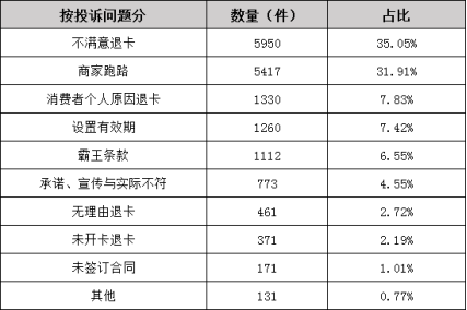 2018年江苏省消保委系统受理的预付式消费的投诉数据显示,关于预付卡的投诉问题,排在前三的分别为消费者不满意要求退卡、商家跑路、消费者个人原因退卡。