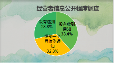 在“经营者停业、歇业或者变更经营场所时,您是否提前一个月收到经营者的通知”的调查问卷中,38.4%的消费者没有收到通知,32.8%的消费者提前一个月接收到通知,另外还有28.8%没有遇到经营者停业、歇业或者变更经营场所的情况。