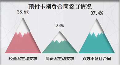线上问卷调查中,只有38.6%的经营者在为消费者办理预付卡时主动签订消费合同,24%是消费者主动要求签订合同,另外还有37.4%没有签订合同。