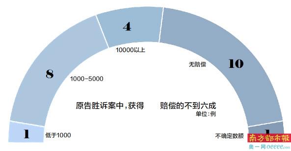 南都记者统计30份文书发现,在24起原告胜诉的案件中,只有不到六成(14起)案件的原告获得经济损失、精神损害抚慰金等形式的赔偿,其中赔偿金额上万的仅四起。