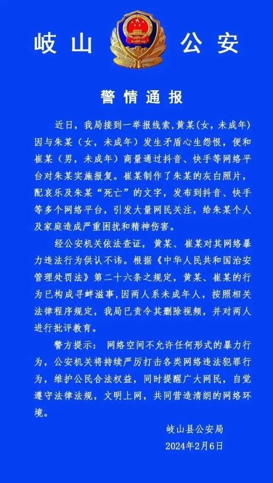 11.两名未成年人网络造谣他人“已死亡”,警方通报来了:近日,陕西宝鸡岐山县公安局接到一举报线索,黄某(女,未成年)因与朱某(女,未成年)发生矛盾心生怨恨,便和崔某(男,未成年)商量实施报复。崔某制作朱某的灰白照片,配哀乐及朱某“已死亡”的文字,发布到多个网络平台。经公安机关查证,黄某、崔某对其违法行为供认不讳。两人行为已构成寻衅滋事,因均系未成年人,按照相关法律规定,警方责令其删除视频,并进行批评教育。(武汉晨报)