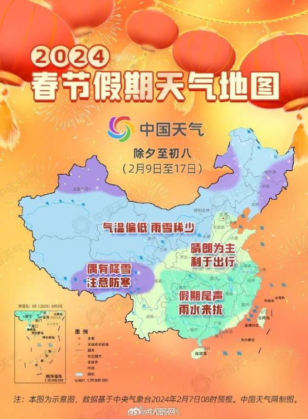 3.2024年春节假期天气地图:我国大部晴好 7日,中央气象台发布春节假期天气预报,预计2024年春节假期(除夕至初八),我国无大范围雨雪冰冻及持续雾霾等灾害性天气,假日前期大部天气晴好,气温回升,后期受冷空气影响,将出现一次降温和雨雪天气过程,返程需注意防寒保暖。(人民网)