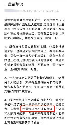 3月18日下午,上述女生发布的文章已被其删除,并发文回应决定不采取自诉。