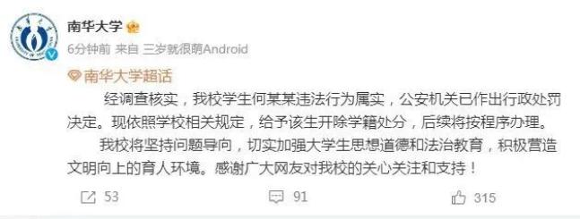 经调查核实,我校学生何某某违法行为属实,公安机关已作出行政处罚决定。现依照学校相关规定,给予该生开除学籍处分,后续将按程序办理。