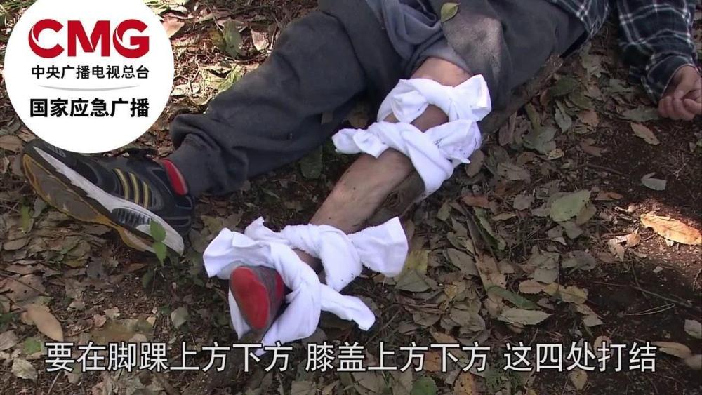 腿部骨折:将支撑物固定住患者周围的关节,如果是小腿骨骨折,要在脚踝上方下方、膝盖上方下方这四处打结,固定住小腿。