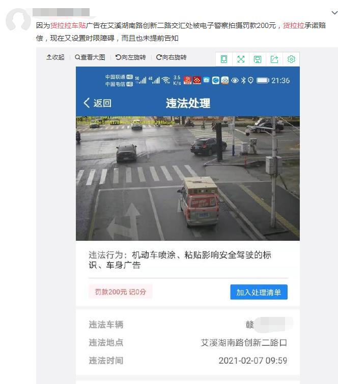 上述司机在社交平台上发布的内容,同样透露了以下几点内容:一是确有不少司机因为货拉拉车贴被交警罚款扣分;二是货拉拉要求司机必须张贴相关车贴,并会不时抽查,司机违反就会被罚款;三是一旦被交警罚款,货拉拉承诺赔偿,但时限需在一个月内。