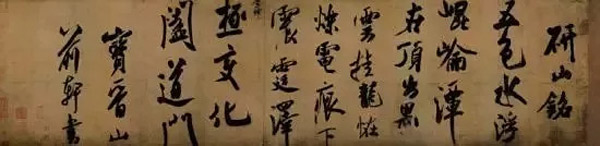 《研山铭》手卷流传有序,曾经入北宋、南宋宫廷。南宋理宗时被右承相贾似道收藏。递传到元代,被当时最负盛名的书画鉴藏家柯九思收藏。清代雍正年间,被书画鉴赏家、四川成都知府于腾收藏。由于历史的原因,被日本有邻博物馆收藏。