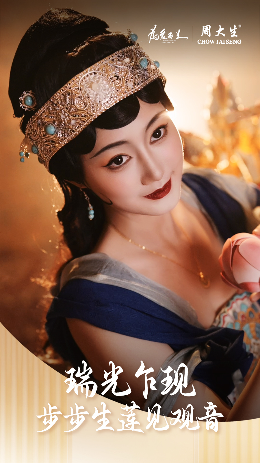 千年丝路,灼灼风华;步步生莲,一路繁花。“步步生莲”设计灵感源自莫高窟第220窟藻井上的团花边饰。团花徐徐绽放,正如千年前的敦煌景象盛现。旖梦沙洲,现藻井生花,叹大漠奇观。团花以莲花为母体,在佛教中是圣洁的象征。花瓣重叠繁复,姿态富丽优美,形成独特的装饰纹样,绚烂、神秘、圣洁的背后更蕴含着“圆融、团圆、吉祥多福”的美好寓意。时代的车轮滚滚向前,敦煌的历史在沧海桑田中并未消逝,众多文化遗产被留存至今,并被后人挖掘、研究、传承,敦煌的灿烂历史穿越千年得以重现。于周大生而言,每一件国宝都有着传奇的前世今生,它们才是真正活在中华民族血液中的基因密码,每一件国宝都是中华民族活着的传承,对于这份扎根在血脉中的民族大爱,周大生给出的答案则是:一眼万年!