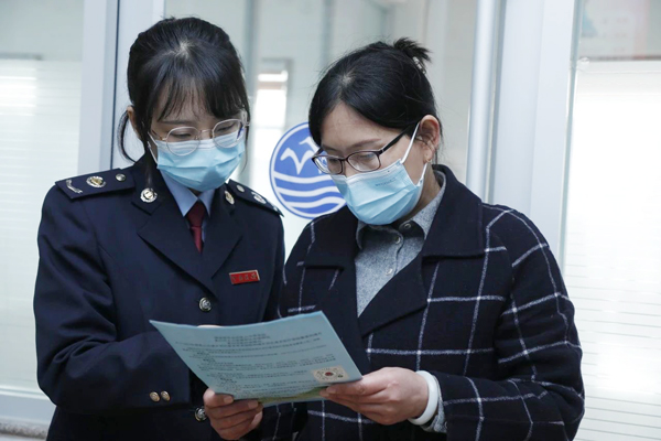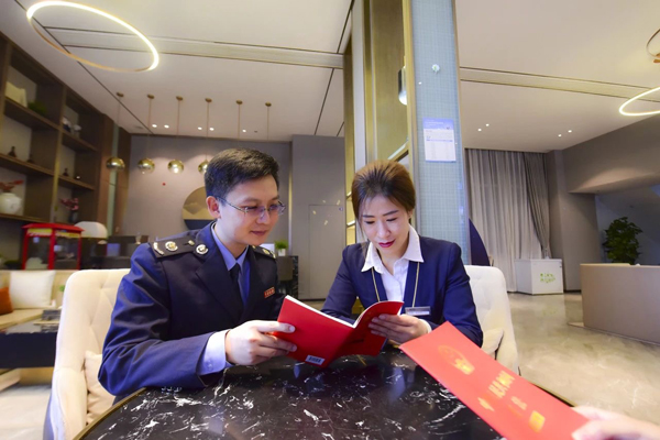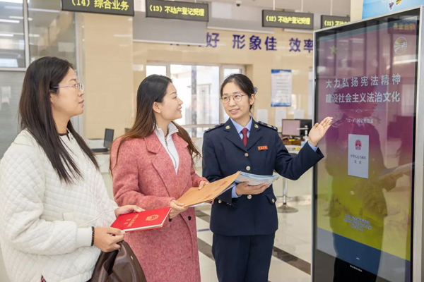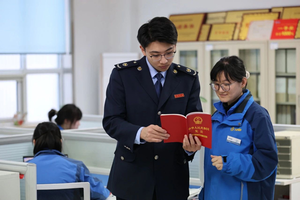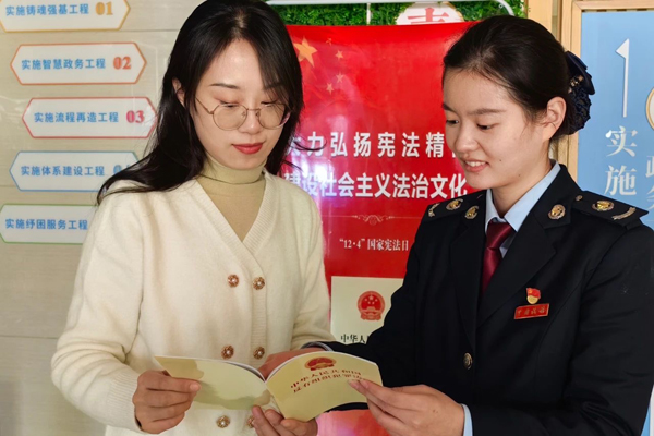 国家税务总局潍坊综合保税区税务局青年干部走进办税服务厅,向自助办税区办税人员广泛宣传宪法,并以此为契机普及税法、民法典等相关法律法规,进一步增强群众法治意识。(图文/董睿)