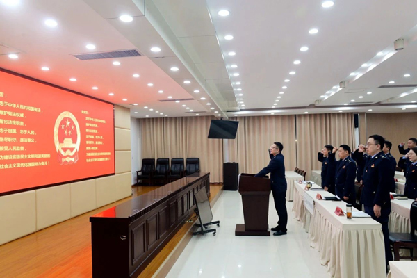 国家税务总局金乡县税务局开展宪法宣誓仪式,宣誓现场气氛庄重严肃,税务干部精神饱满、整装肃立,神圣的仪式,郑重的誓言,表达出对宪法的尊崇、对法治的信仰和对人民的承诺。(图文/邢政)