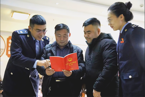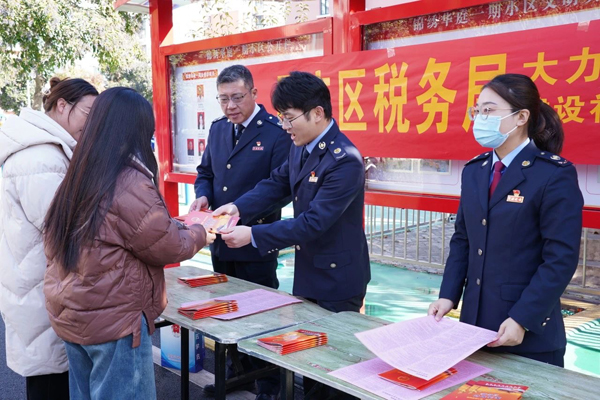 国家税务总局商河县税务局与商河县人民法院、商河县司法局联合开展“宪法在心中 税法伴我行”主题活动,深入村镇大集进行宪法宣传、法律宣传以及居民医保缴费等税费政策宣传,营造尊法学法守法用法的良好氛围。(图/张权 文/韩如月)