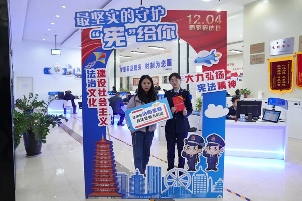 国家税务总局山东省黄河三角洲农业高新技术产业示范区税务局守牢宣传主阵地,在办税服务厅设置“宪法宣传角”,开展以“学宪法 懂税法”为主题的学用宪法系列活动。(图/杜剑 文/孙雪慧)