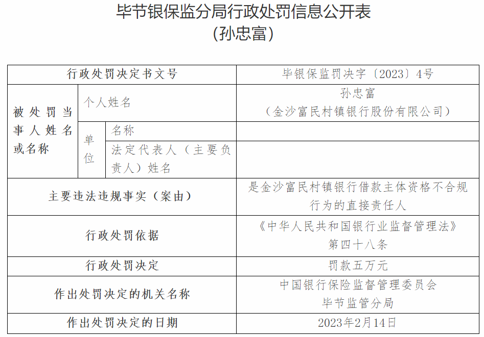 孙忠富作为金沙富民村镇银行借款主体资格不合规行为的直接责任人,依据《中华人民共和国银行业监督管理法》第四十八条,被处罚款五万元。江梅作为金沙富民村镇银行贷款管理不到位行为的直接责任人,依据《中华人民共和国银行业监督管理法》第四十八条,被处警告。