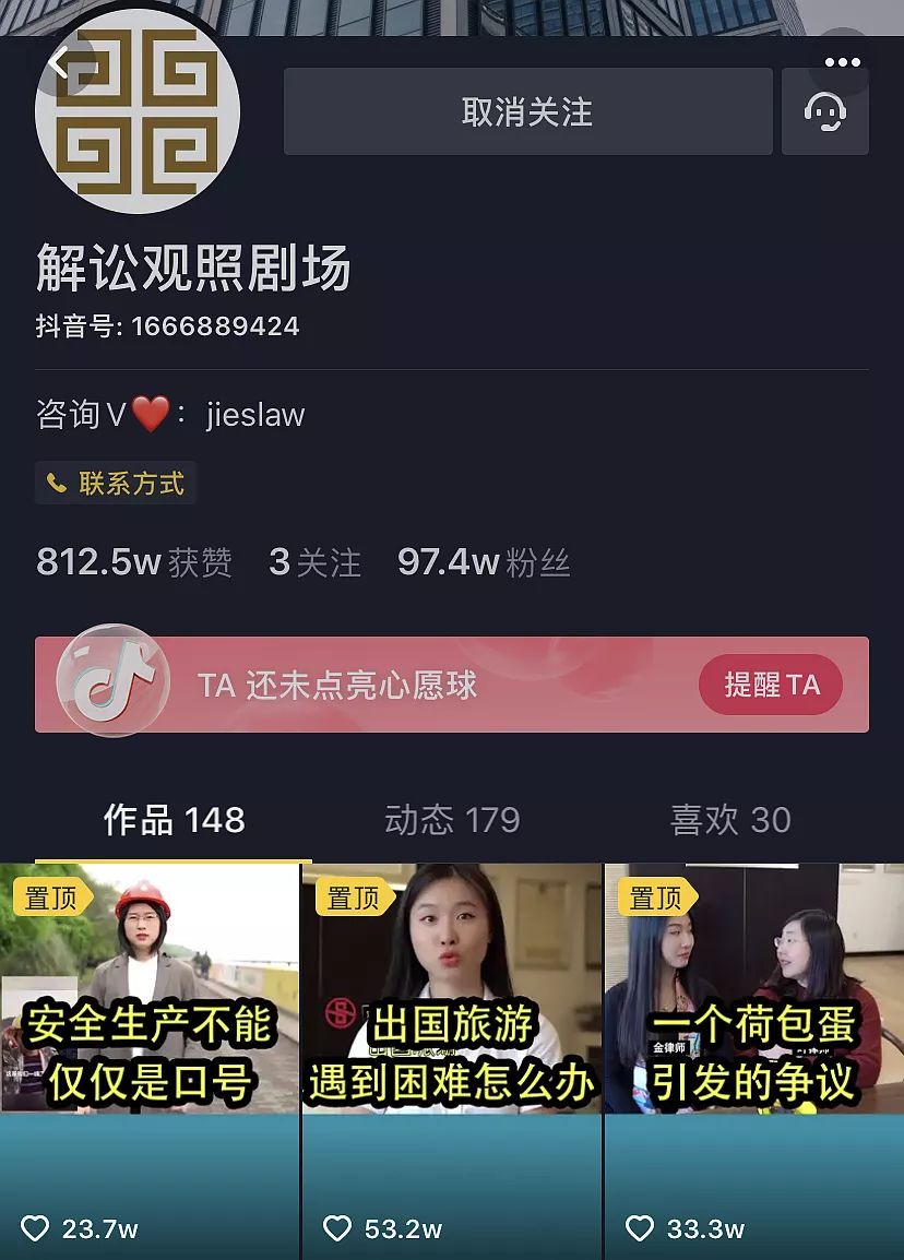 浙江观照律师事务所于2018年在抖音、火山等平台创办“解讼剧场”,利用老百姓喜闻乐见的短视频形式向社会大众进行普法宣传。“解讼剧场”开播至今,已播出短视频近400个,全网播放量近10亿,几个平台粉丝人数累计近280万。