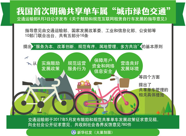 8月2日,经国务院同意,交通运输部、中央宣传部、中央网信办、国家发展改革委、工业和信息化部、公安部、住房城乡建设部、人民银行、质检总局、国家旅游局10部门联合出台了《关于鼓励和规范互联网租赁自行车发展的指导意见》。为提升共享单车服务水平,《指导意见》明确要求运营企业要加强线上线下服务能力建设,对用户注册使用实行实名制管理并签订服务协议,明示计费方式和标准,建立投诉处理机制,为用户购买人身意外伤害险,禁止向未满12岁的儿童提供服务。>>