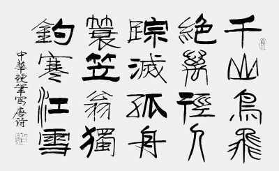 从那时起,我就开始关注海内外生产的各种新式硬笔,发现日本、德国、美国生产的硬笔花色品种近两千种,质量好,笔头粗,可以用来创作大幅硬笔书法作品。于是我开始使用这种粗头硬笔写字,很快找到感觉。尤其是1982年我在《解放军报》上读到马克思关于“武器的发展决定作战方式的变革”,顿时感悟道,“书写工具的发展决定书法艺术的变革”。于是我说服国内制笔厂家生产这种新式硬笔,厂家没有热情;我就自己来生产,也告失败。直到本世纪初,在中国制笔协会领导者的大力支持下,我们和香港盛怡文化公司通力合作,经三年潜心研制,终于生产出质地上乘、外观俊美,可以创作从蝇头小楷到碗口般大字各种作品的全新硬笔,厂家将此种笔命名为“庞中华牌书法笔”,这种新型硬笔可以在宣纸、布帛、塑料、木料、陶瓷和玻璃上书写。我用它们创作了许多大幅作品,从四尺整张到10米长的巨幅。用其中的方头硬笔创作的篆、隶、行、草书法作品,或方峻如刀切,或飘逸如柳丝,粗细变化大起大落,显示出硬笔特有的风格,给人视觉以新颖独到之感。我分别在从艺20周年(2000年)和30周年(2010年)之际,在国家博物馆和军事博物馆举办了大型艺术展,展出了我的毛笔和硬笔书法作品,观众像过节一样欢欣鼓舞,就连那些对硬笔书法艺术创作认识不足或存有偏见的人也感到了震撼,见证了硬笔书法丰富的表现力和群众性。我相信这种笔将带给广大书法爱好者方便与享受,改变中国人的书写习惯,提高他们的书法兴趣。面对此笔,我感慨万千,人间做事多不容易,因为这支小笔,竟用去我二十多年的期待与求索。