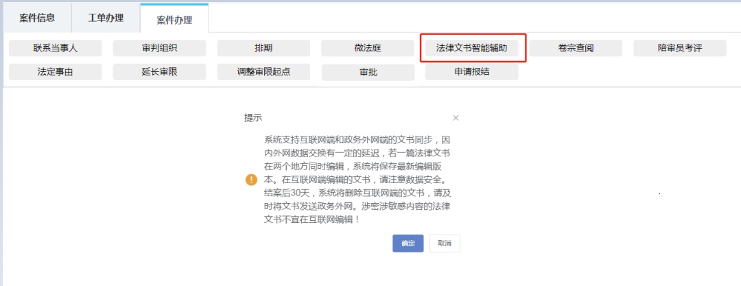 点击页面中间的“法律文书智能辅助”模块,弹出温馨提示信息,点击“确认”进入系统。