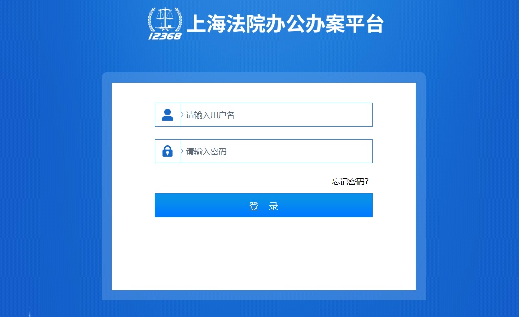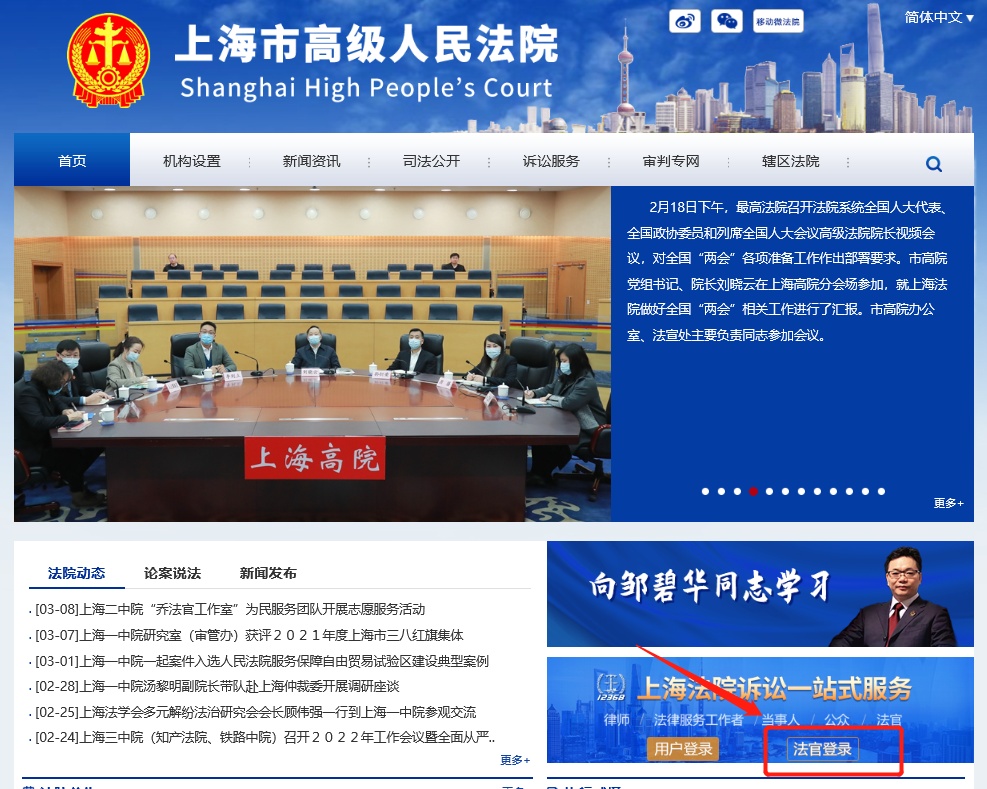 在浏览器中输入网址:,进入“上海市高级人民法院”网站。点击“法官登录”,进入“上海法院办公办案平台”。