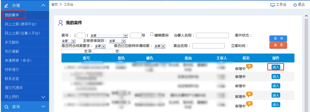 点击工作台左侧“我的案件”,选中某件需要办理的案件,点击“进入”按钮。