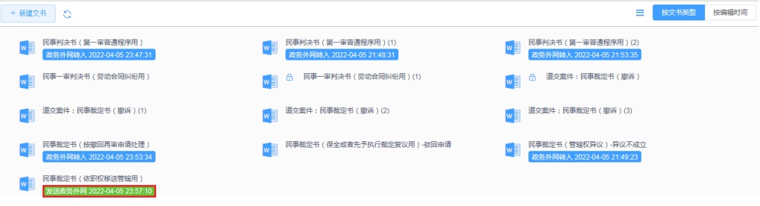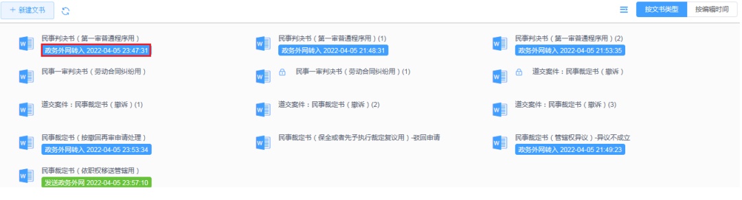注意,目前可在互联网端制作的法律文书类型包括“判决书”“裁定书”“调解书”“决定书”。在互联网和政务外网双向同步的法律文书类型也为这四类。除这四类外的其他文书(报告、函、批复、命令)仍在政务外网“法律文书智能辅助”中制作。
