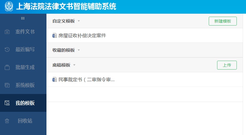 点击“新建文书”选择模板时,会弹出“系统模板”,它依据上海法院颁发的相关文书规定,预编制了200多个常用文书模板,能够帮助法官更快速地制作符合规范要求的法律文书。