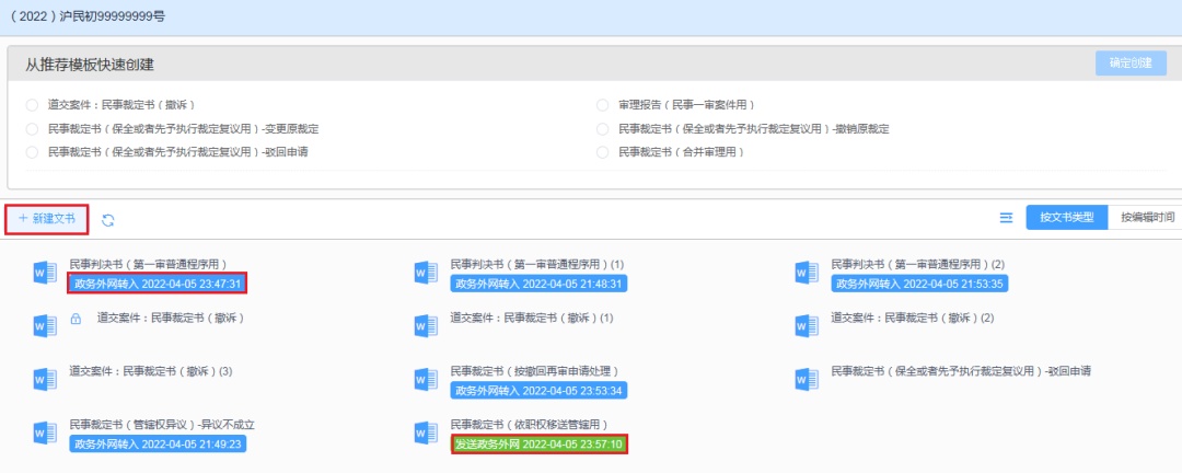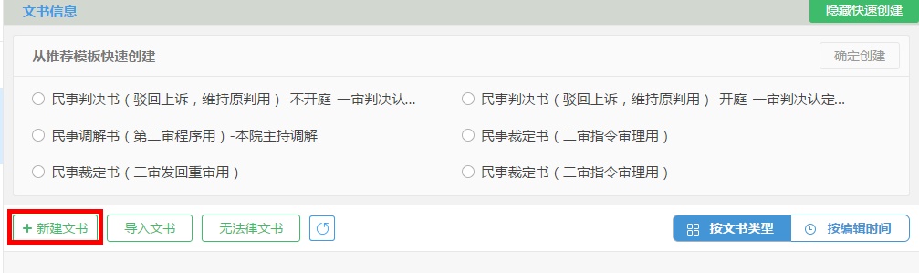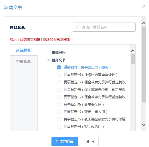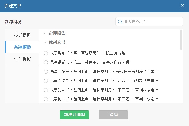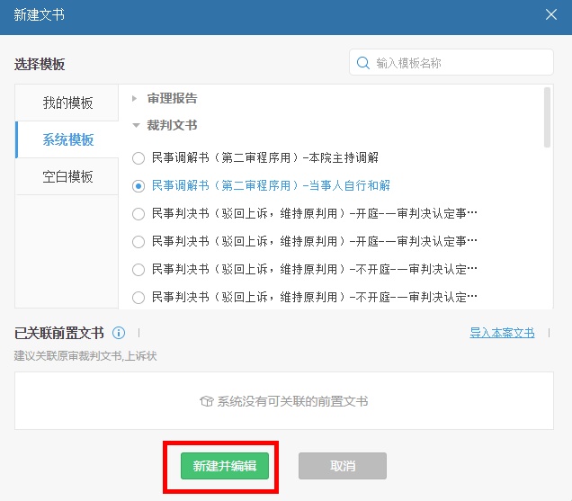 在文书信息页面中,点击“新建文书”,并选择模板。模板分为系统模板、空白模板。选择一类文书,点击“新建并编辑”。