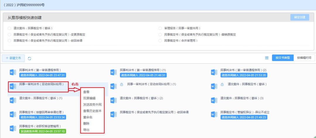 新增/上传完毕后,就可以使用自定义模板/底稿模板新建文书了。