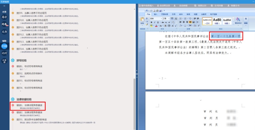 在政务外网端使用“双屏编辑”时,点击最上方工具栏中的“文书纠错”按钮,系统会对法律文书进行纠错分析,并依据准确度高低情况,对疑似差错的内容分别用不同字体颜色进行警示。
