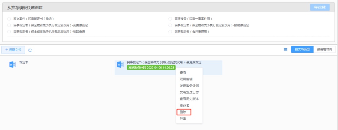 如果想删除文书,可在文书列表中选择一篇文书右击,选中“删除”进行删除。注意:同步到政务外网的文书若已发送签发,则不可删除。