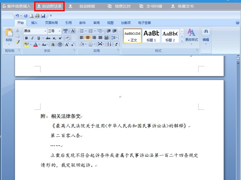 在政务外网端使用“双屏编辑”时,点击最上方工具栏中的“自动附法条”按钮,系统可以自动解析文书内容中所引用的法律条文,并附录在文书后面。