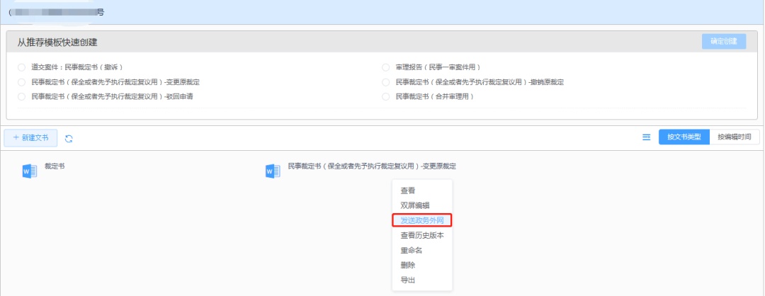 选择一篇文书右击,选中“发送政务外网”,可实现将文书从互联网同步到政务外网,继续后续的签发流程。