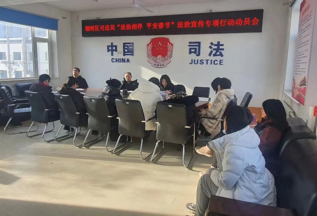 细河区司法局召开“法治相伴 平安春节”法治宣传专项行动动员会,进一步发挥普法志愿者、村居法律顾问、法律明白人、人民调解员等力量作用。