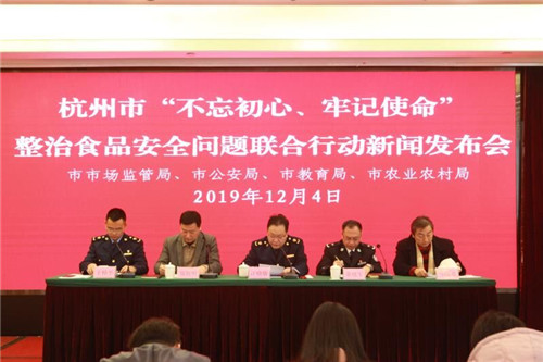 中国质量新闻网讯(鲁利军 通讯员 王敏) 12月4日,浙江省杭州市市场监管局、公安局、教育局、农业农村局召开“不忘初心、牢记使命”主题教育中开展整治食品安全问题联合行动新闻发布会,对联合行动工作进行总结评估,及时公布联合行动取得的成效。会上,杭州市市场监管局副局级党委委员汪晓敏通报了联合行动总体情况,公布了联合行动典型案例,杭州市市场监管局、公安局、教育局、农业农村局业务处室负责人回答了媒体提问。杭州市余杭区、临安区、拱墅区等地有关代表出席了发布会。