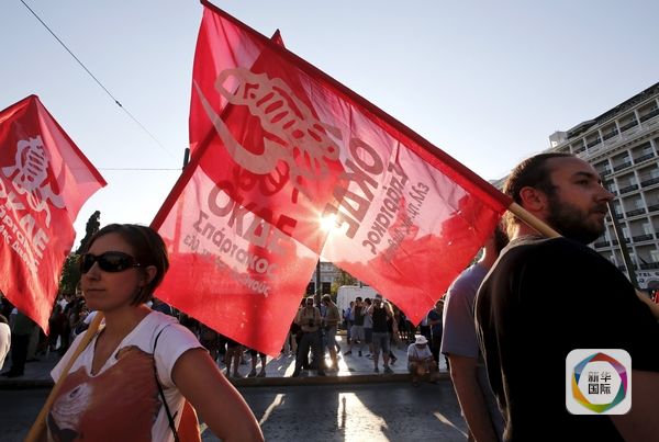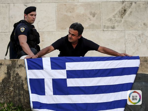 反对欧盟的抗议者在雅典议会大厦外展开希腊国旗。(图片来源:新华/路透)