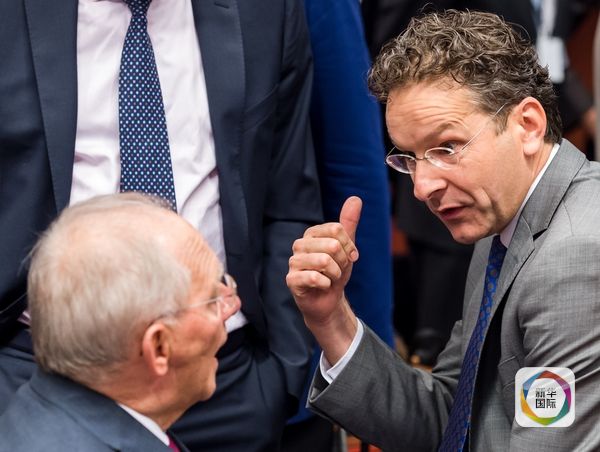 德国财长朔伊布勒(左)与欧元集团主席戴塞尔布卢姆交谈。(图片来源:新华/美联)