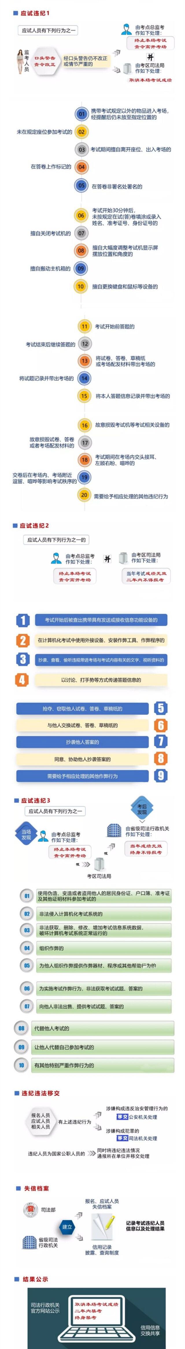 此前,司法部颁布了《国家统一法律职业资格考试违纪行为处理办法》,对于考试期间擅自关闭考试机、大幅度调整考试机显示屏位置等行为的,监考人员给予口头警告、责令改正,拒不改正的终止本场考试,并由考区所在地的行政司法机关取消本场考试成绩,情节严重的两年内乃至终身不得报名参加国家统一法律职业资格考试,构成犯罪的还要移送司法机关处理。