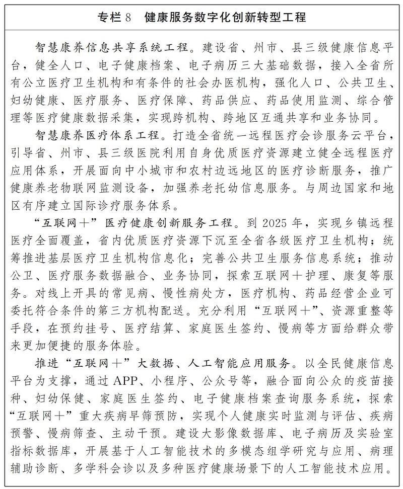 依托省、州、市优质医疗资源,积极引进国内优质医疗资源,加快国家心血管、呼吸、肿瘤等区域医疗中心建设,促进医疗服务高端化、专业化、智慧化发展。