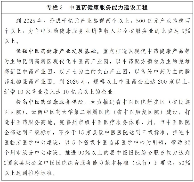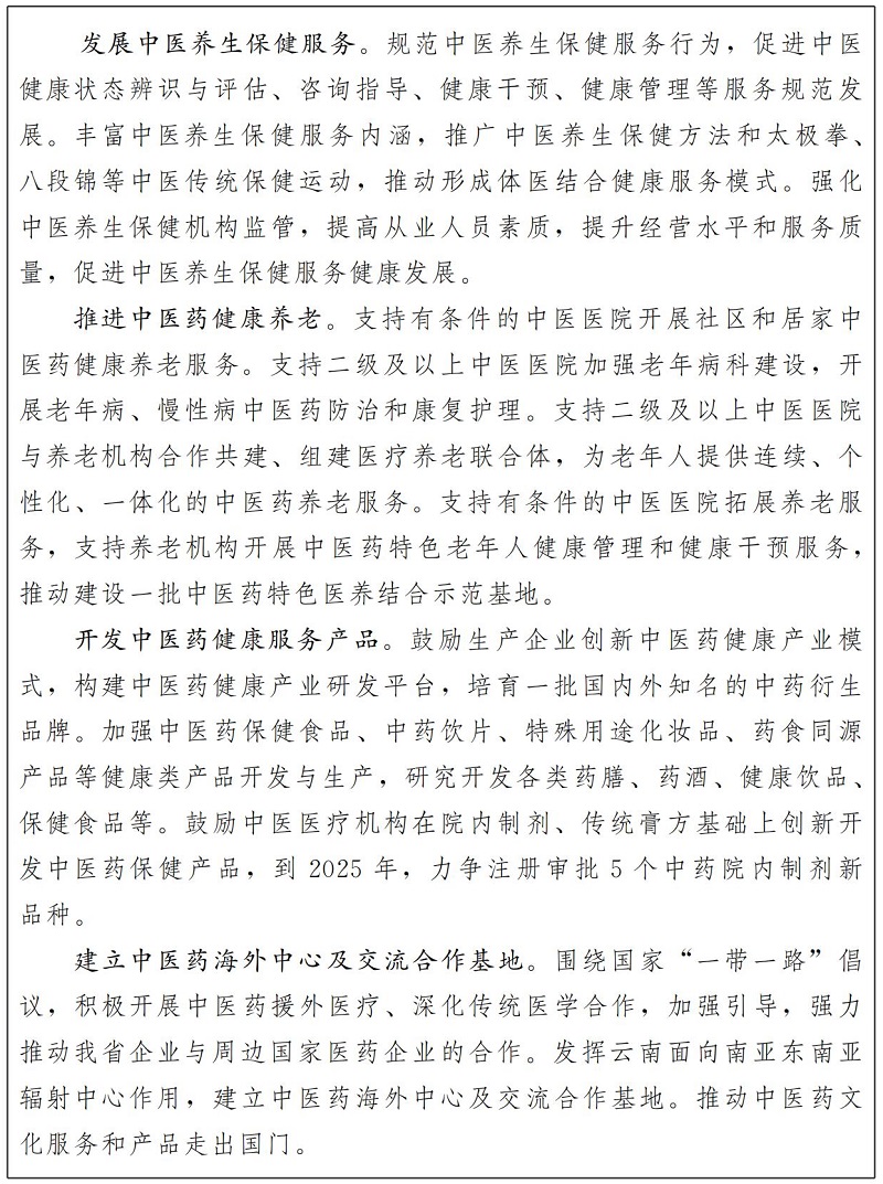 充分发挥中医药在治未病中的主导作用、在重大疾病治疗中的协同作用、在疾病康复中的核心作用,全力推进中医药养生服务发展,做优基地、做强企业、做精产品、做大集群、做响品牌。在稳定种植面积的基础上,大力实施道地中药材提升工程。突出中药龙头企业带动作用,发展壮大一批专精特新“小巨人”企业、瞪羚企业、单项冠军企业。以傣医药、彝医药为突破口,全力推动民族医药标准化体系建设,打造全国傣、彝等民族医药产业集聚区。鼓励以民间单方、验方等为基础的院内制剂开发,支持中药创新药、改良型新药、古代经典名方中药复方制剂、同名同方药申报,加强二次开发,大力挖掘药食两用、保健食品、植物提取物和化妆品等产品。加快中药材交易市场建设,将昆明菊花园中药材市场打造成国内知名、辐射南亚东南亚的国际区域性南药交易中心。深度挖掘推广中医药、民族医药特色诊疗保健技术和服务,推动一批专业化园区建设。鼓励和支持省内中药龙头企业参与国际国内标准制定,强化中药材质量控制与监管,创新业态,推进中医药产业与乡村振兴、养生养老、健康旅游、田园综合体等融合发展。加快“十大云药”区域公用品牌建设,提升“十大名药材”产品品牌知名度,打造我省中医药、民族医药品牌。支持将中医药文化元素充分融入特色旅游城镇、休闲度假区、文化街区、主题公园、森林康养基地等,形成一批与中药科技农业、道地中药材种植、田园风情生态休闲旅游结合的养生体验和观赏基地。