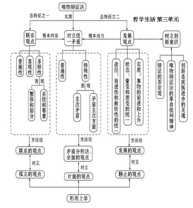 4、联系的观点,发展的观点是唯物辩证法的基本观点;对立统一规律是唯物辩证法的实质和核心;矛盾分析法是我们认识世界问题的根本方法。