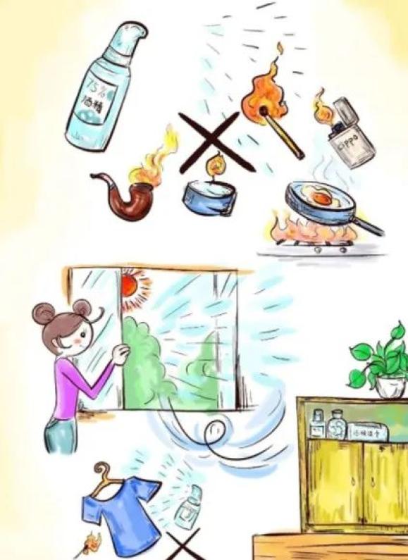 4.居家使用的酒精喷雾等消毒用品,要适当保存,应远离火源,严禁未成年人玩耍。居家消毒时,注意不要对插座、开关、电器等带电设备过量喷洒液体消毒剂,以免引发短路导致火灾。
