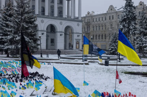基辅的独立广场上,一名男子走过纪念在俄罗斯对乌克兰的战争中丧生的军人纪念点(路透社)
