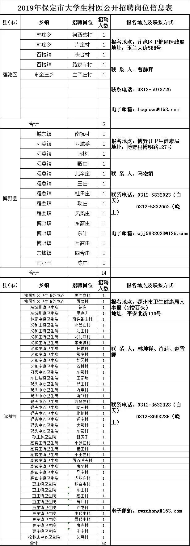 本次公开招聘大学生村医61名(莲池区、博野县、涿州市),(招聘岗位、招聘人数见《2019年保定市大学生村医公开招聘岗位信息表》)。