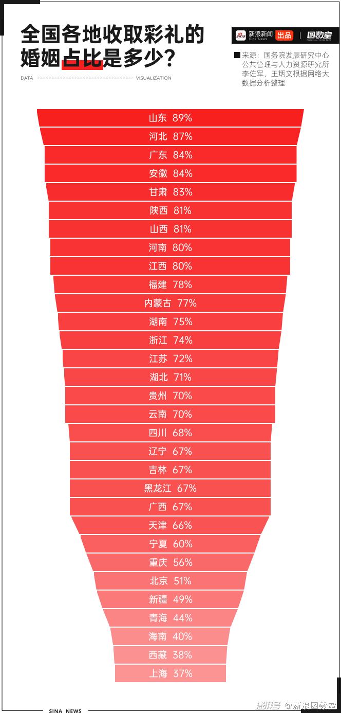 山东以89%的比例成为最流行收取彩礼的地区,河北、广东、安徽、甘肃等省收取彩礼占比也较高。上海占比37%,为全国最低,同为直辖市的天津、重庆和北京的比例分别为66%、56%和51%。新疆、青海、海南、西藏等偏远地区的比例也较低。