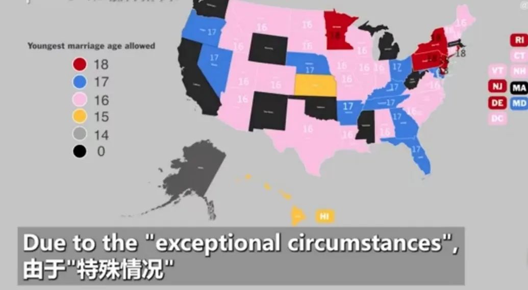 网络流传的视频展示了美国各州最低结婚年龄限制,其中明尼苏达州、宾夕法尼亚州、纽约州、特拉华州、新泽西州、罗德岛州6个州完全禁止童婚,华盛顿州、加利福尼亚州、怀俄明州、新墨西哥州、俄克拉荷马州、密歇根州、西弗吉尼亚州、马萨诸塞州、密西西比州等9州没有最低结婚年龄限制,其他州最低结婚年龄为14-17岁不等。