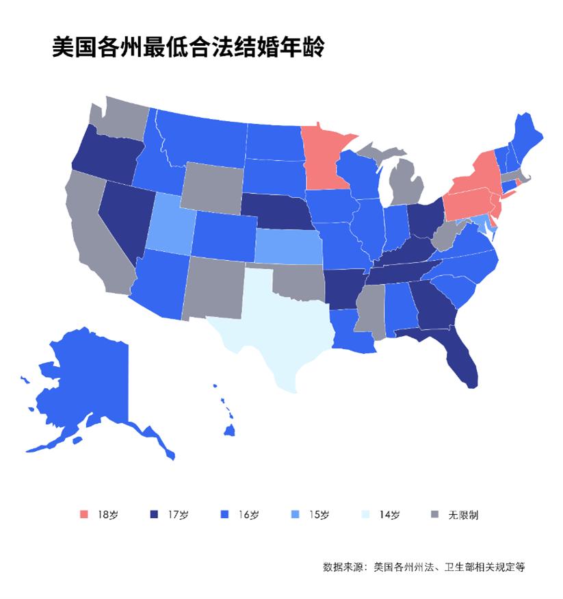 实际上,纽约州、罗德岛州等都是近两年才将最低结婚年龄提高到18岁,北卡罗莱纳州等也是在近几年才将最低合法结婚年龄提高到16岁,在过往,美国的未成年婚姻现象更为严重。