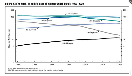 未成年生育率是未成年婚姻现象的映射。根据美国疾病预防与控制中心的数据,2020年美国15-19岁女性的生育率为1.5%左右,而在30年前,这一比例曾高达6%。