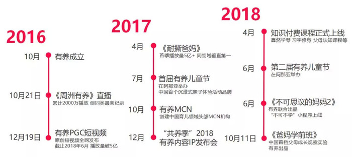 正因看到行业的软肋与生机,有养致力于为0-12岁孩子的父母提供体系化的原创父母教育视频和个性化的父母成长知识服务,引领新一代父母教育观念及方式的全面升级,通过网综、短视频、知识付费产品、线下活动等形式,以高品质的父母教育内容、成长资源与教育产品形成有养的多维度内容矩阵,打造亲职教育体系。